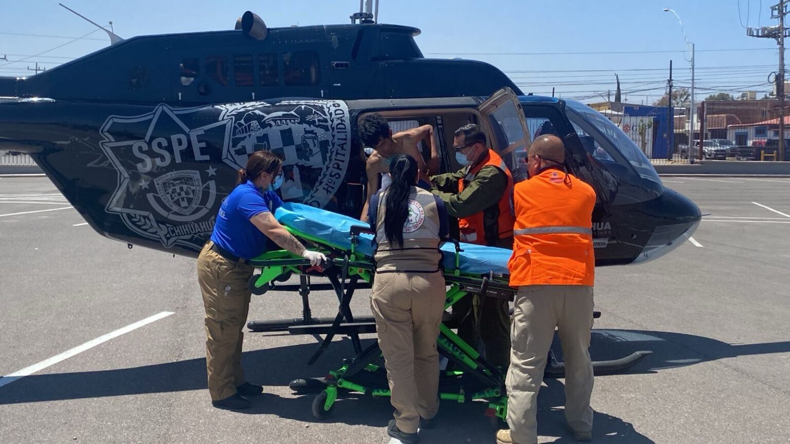 Posteriormente, fue abordado en la aeronave por personal médico de la CEPC para ser trasladado al Centro de Convenciones en la ciudad de Chihuahua, donde personal paramédico de la Unidad de Rescate del Gobierno del Estado lo evaluó y lo transportó vía terrestre al Hospital Central para realizar una revisión médica más detallada.