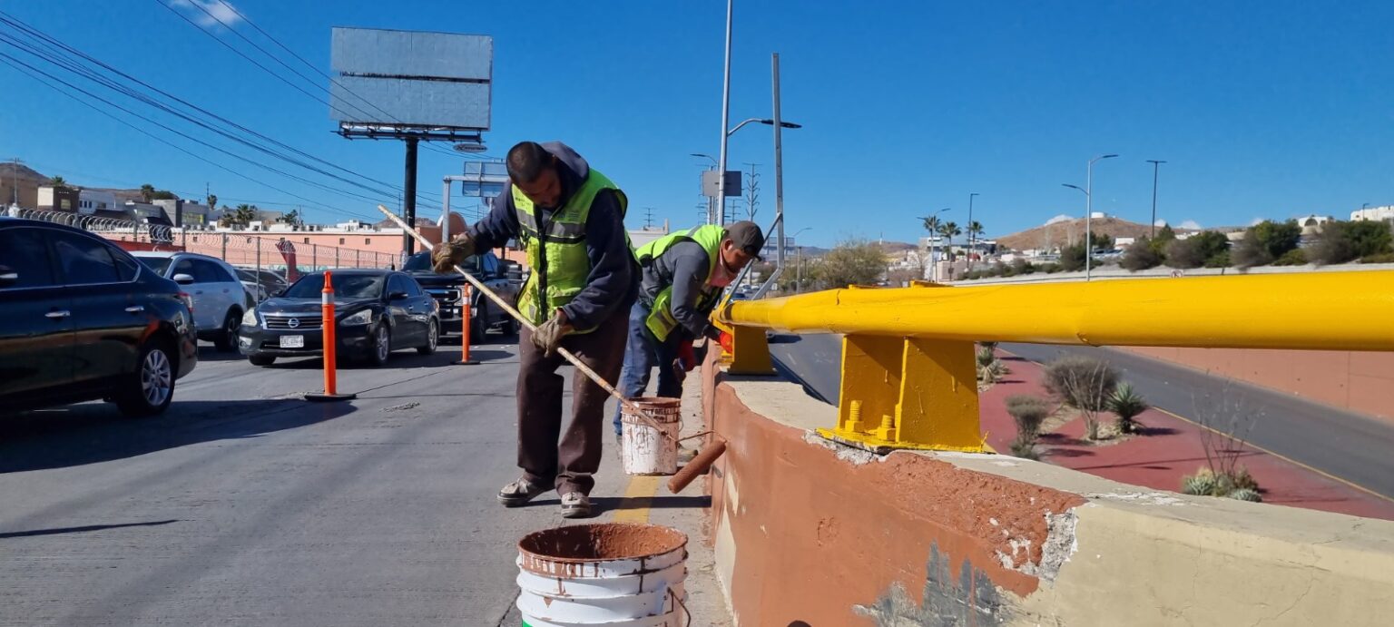 Los trabajos de pintura se realizaron en los muros de contención del bajo puente, así como en los barandales metálicos y muros de la parte superior de la intersección. En total, se pintaron más de mil 400 metros lineales de barandillas y muros, con un consumo de más de 268 litros de pintura.