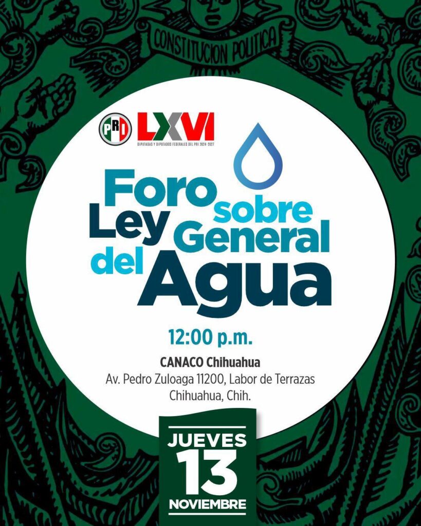 Es por lo anterior que este jueves 13 de noviembre, se realizará el Foro sobre Ley General del Agua, para escuchar y atender a la población que desee participar y conocer más acerca de este tema.