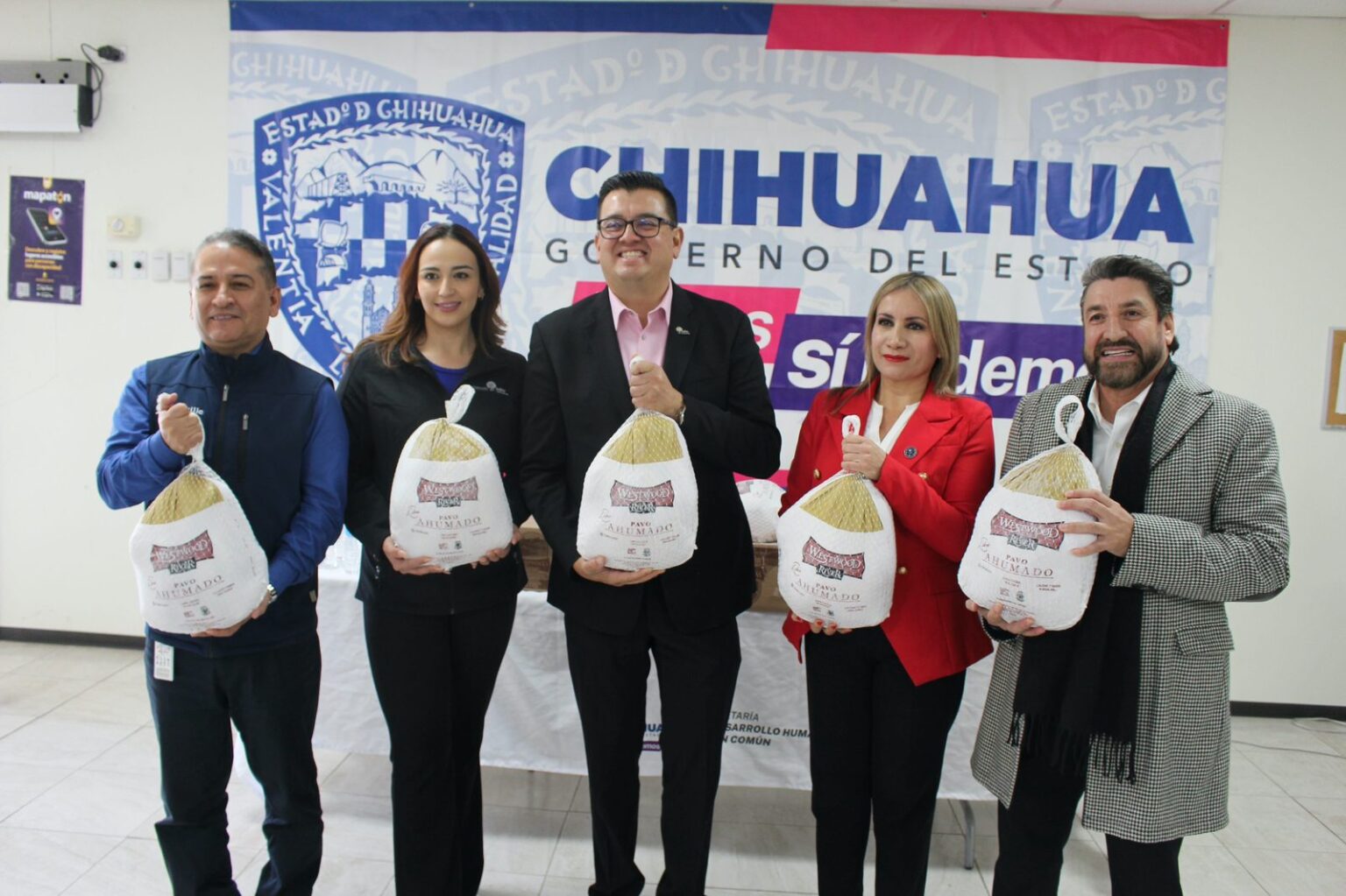 En conjunto con la directora de Grupos Vulnerables, Raquel Jiménez Rodríguez de la Secretaría de Desarrollo Humano y Bien Común, Gómez Gallegos recibió del presidente de INDEX, Román Rivas Hong y representantes del sector industrial, 352 pavos para la cena navideña en diferentes zonas de la entidad