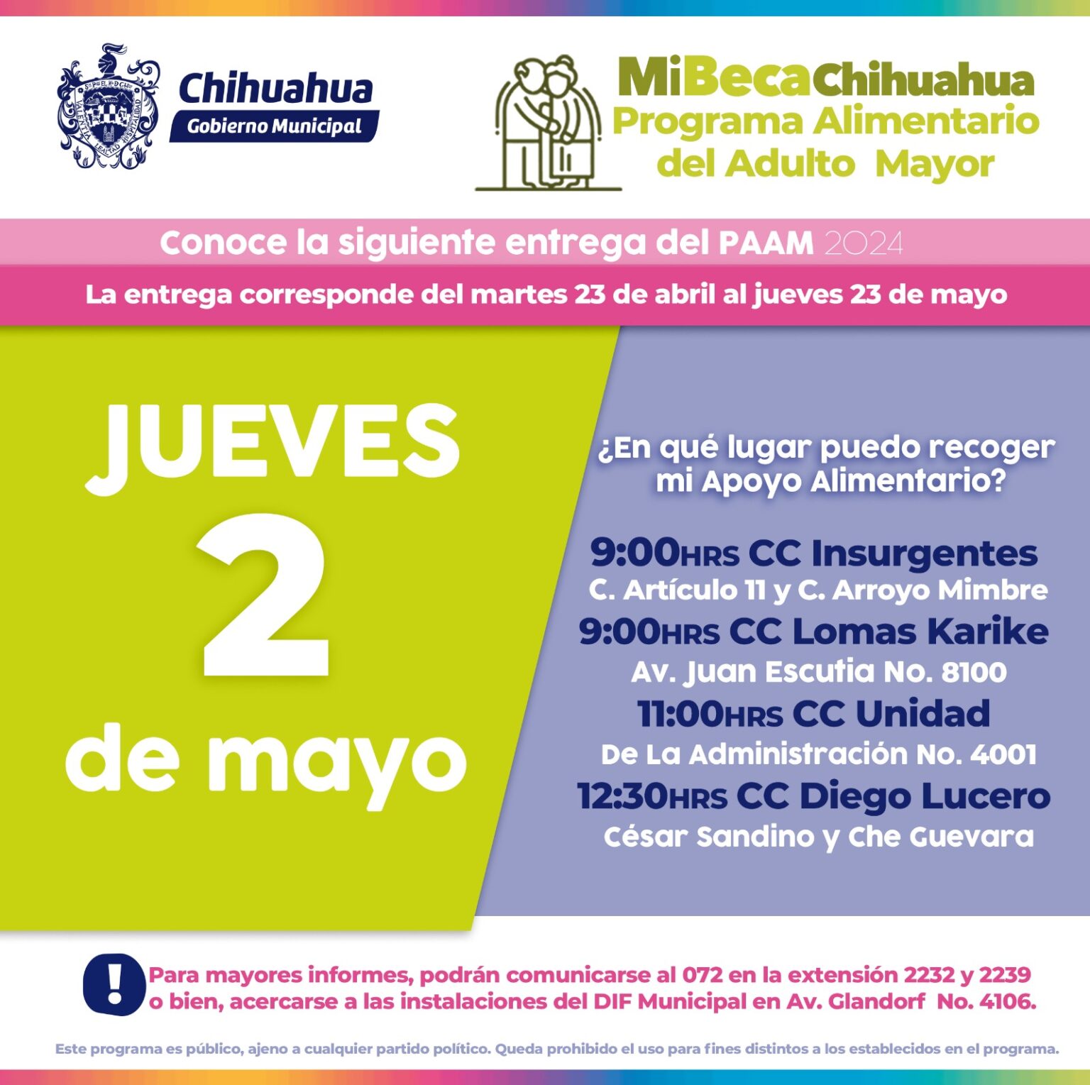 El Gobierno Municipal, a través del DIF, informó a los seleccionados del Programa Alimentario del Adulto Mayor (PAAM) que podrán acudir por su paquete alimentario este jueves 2 de mayo, a los siguientes centros comunitarios: