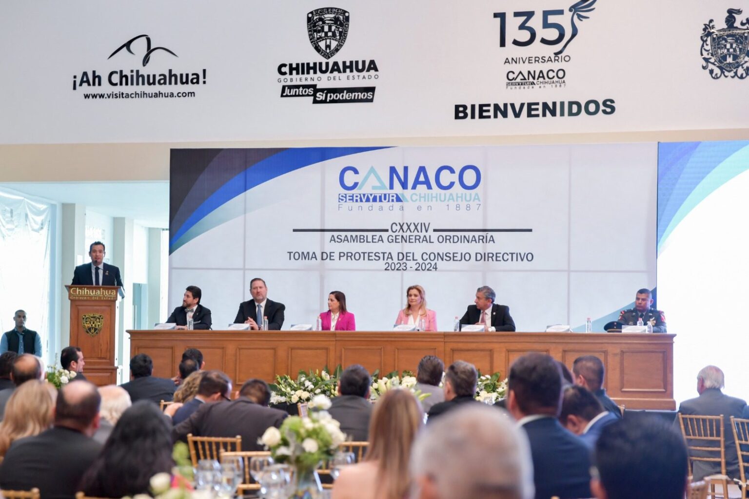 La Gobernadora Maru Campos, encabezó la CXXXIV Asamblea General Ordinaria de la Cámara Nacional de Comercio, Servicios y Turismo (Canaco-Servytur) Chihuahua, donde le tomó la protesta al Consejo Directivo 2023-2024, que será presidido por Omar Armendáriz Jurado.