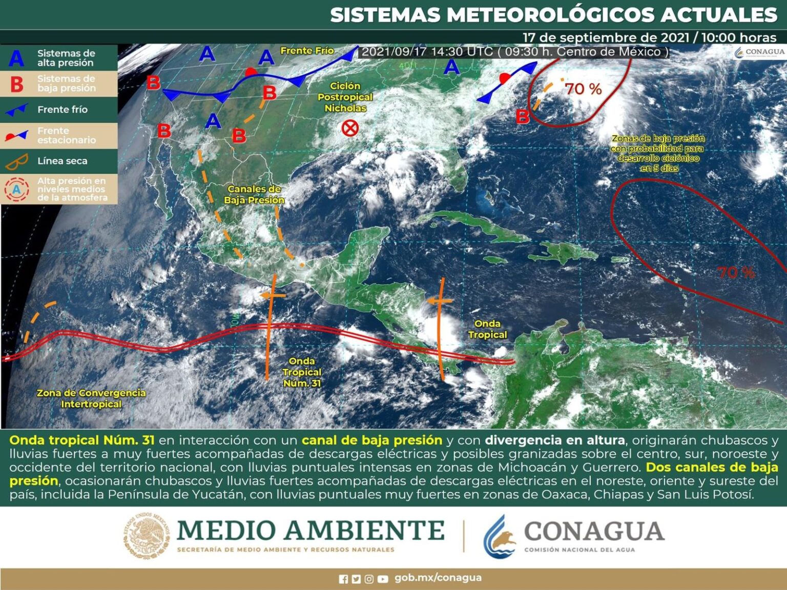 Se esperan lluvias de aisladas a dispersas (de 2.1 a 5 mm) en partes de las zonas noroeste, occidente, suroeste y noreste, incluye Janos, Madera, Temósachic, Ocampo, Moris, Bocoyna, Chínipas, Batopilas, Guadalupe y Calvo, Guachochi, Balleza y Manuel Benavides; lluvias aisladas (de 0.1 a 2 mm) en parte de las zonas norte, noroeste, occidente y suroeste, incluye Ahumada, Buenaventura, Guerrero, Guazapares y Nonoava. Las lluvias pueden estar acompañadas de descargas eléctricas y posible caída de granizo.