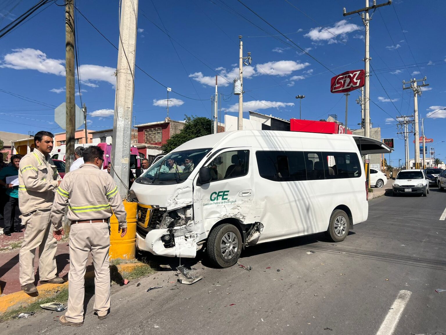 Empleados de la Comisión Federal de Electricidad viajaban en una camioneta Urban color blanco sobre la avenida Pacheco y terminaron impactados contra una camioneta Pick Up, propiedad del Municipio, debido al choque, la camioneta Urban terminó golpeando contra un poste de la misma empresa (CFE).