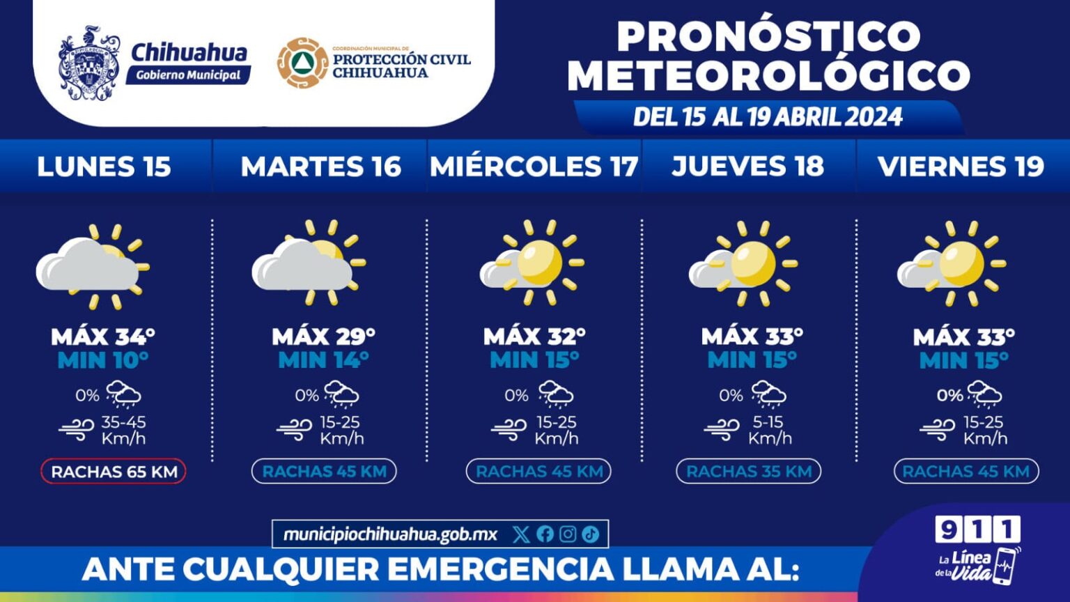 Chihuahua, Chih.- La Coordinación de Protección Civil Municipal informa que esta semana se pronostican temperaturas máximas de 34 °C con mínimas de 10°C, con vientos fuertes para este lunes en particular.