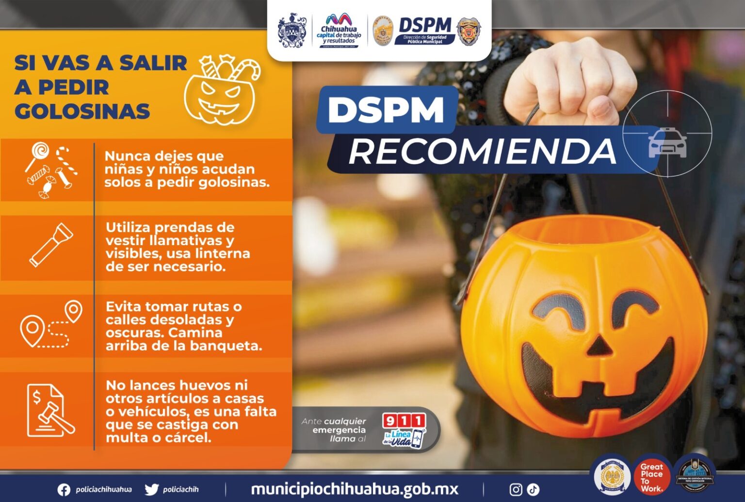 Ante la llegada de la próxima “Noche de Brujas o Halloween”, como se le llama a la última noche del mes de octubre, en que muchas niñas, niños y adolescentes acostumbran disfrazarse para salir a recorrer las calles de sus colonias y pedir dulces, la Dirección de Seguridad Pública Municipal (DSPM) pide a los padres, acompañarlos siempre y seguir recomendaciones básicas para prevenir incidentes.