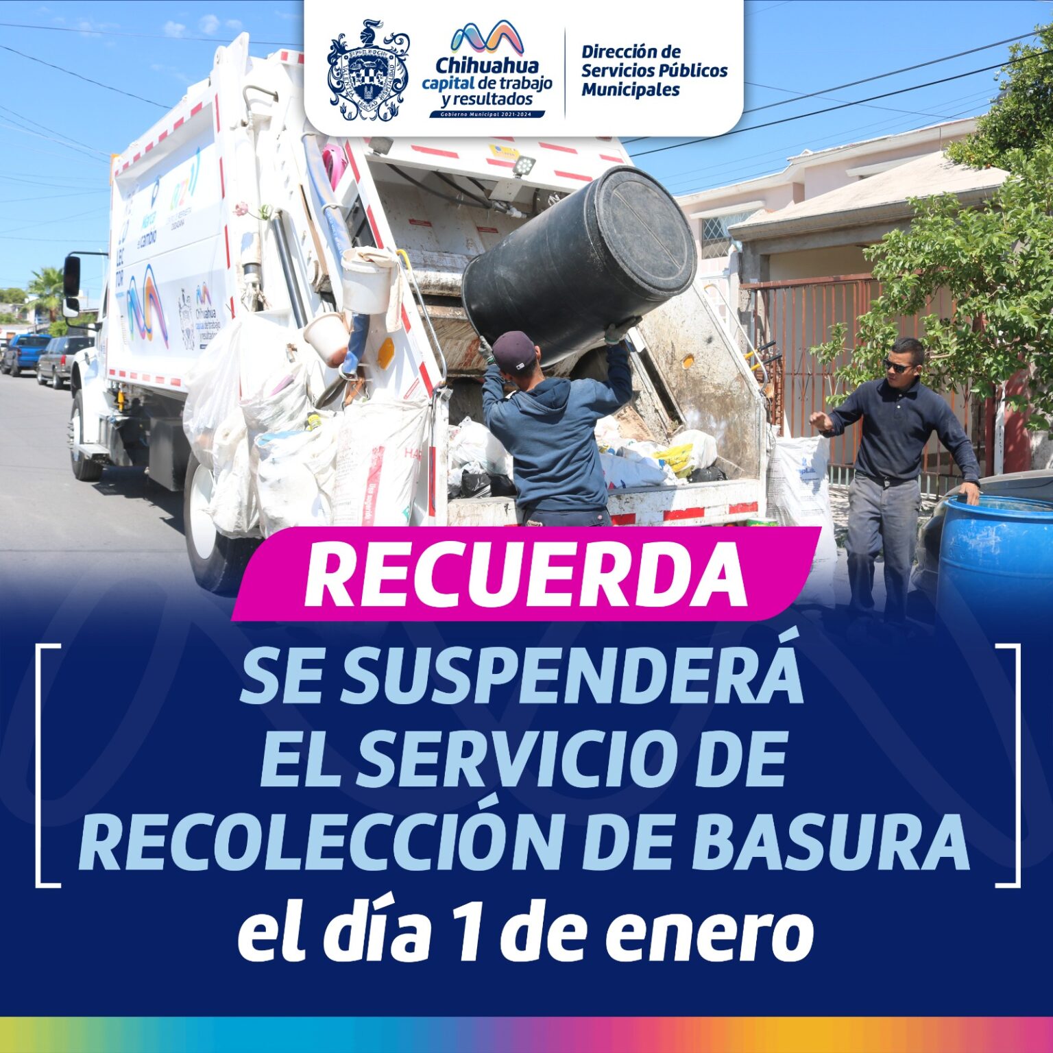 La Dirección de Servicios Públicos Municipales, informa a la ciudadanía en general que con motivo de la celebración de las fiestas decembrinas y la llegada del año nuevo, el próximo lunes 1 de enero, el servicio de recolección de basura se suspenderá.