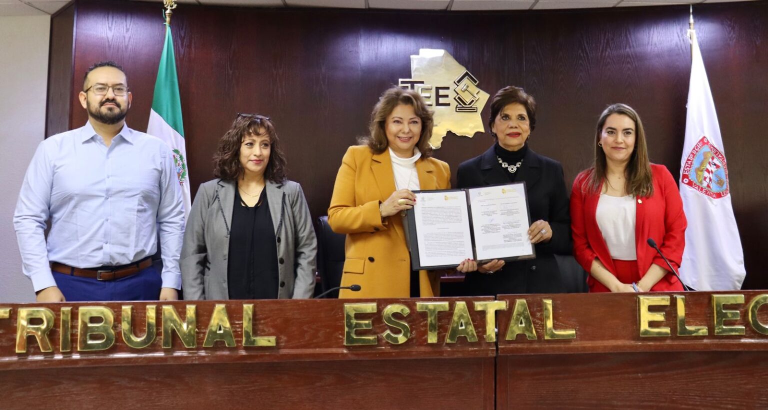 Dicho convenio fue signado por la Lic. María de los Ángeles Álvarez Hurtado, Secretaria de la SFP, la Mtra. Roxana García Moreno, Magistrada Presidenta del TEE, la Ing. Liliana Iveth Puentes Trevizo, Titular del Órgano Interno de Control del TEE, la Lic. Adriana Medina García, Encargada de Despacho de la Coordinación de Tecnologías de Información de la SFP y el Ing. Miguel Ángel Solís Durán, Coordinador de Sistemas del TEE.