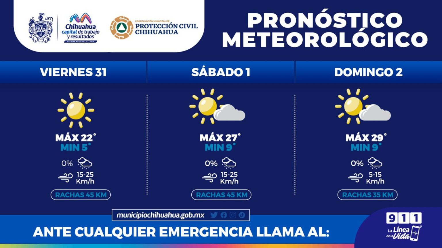 Para sábado se prevé una máxima de 27°C y mínima de 9°C, con ráfagas de viento de hasta de 45 kilómetros por hora y finalmente el domingo será el más caluroso, pronosticar como temperatura máxima 29°C y una mínima de 9°C.